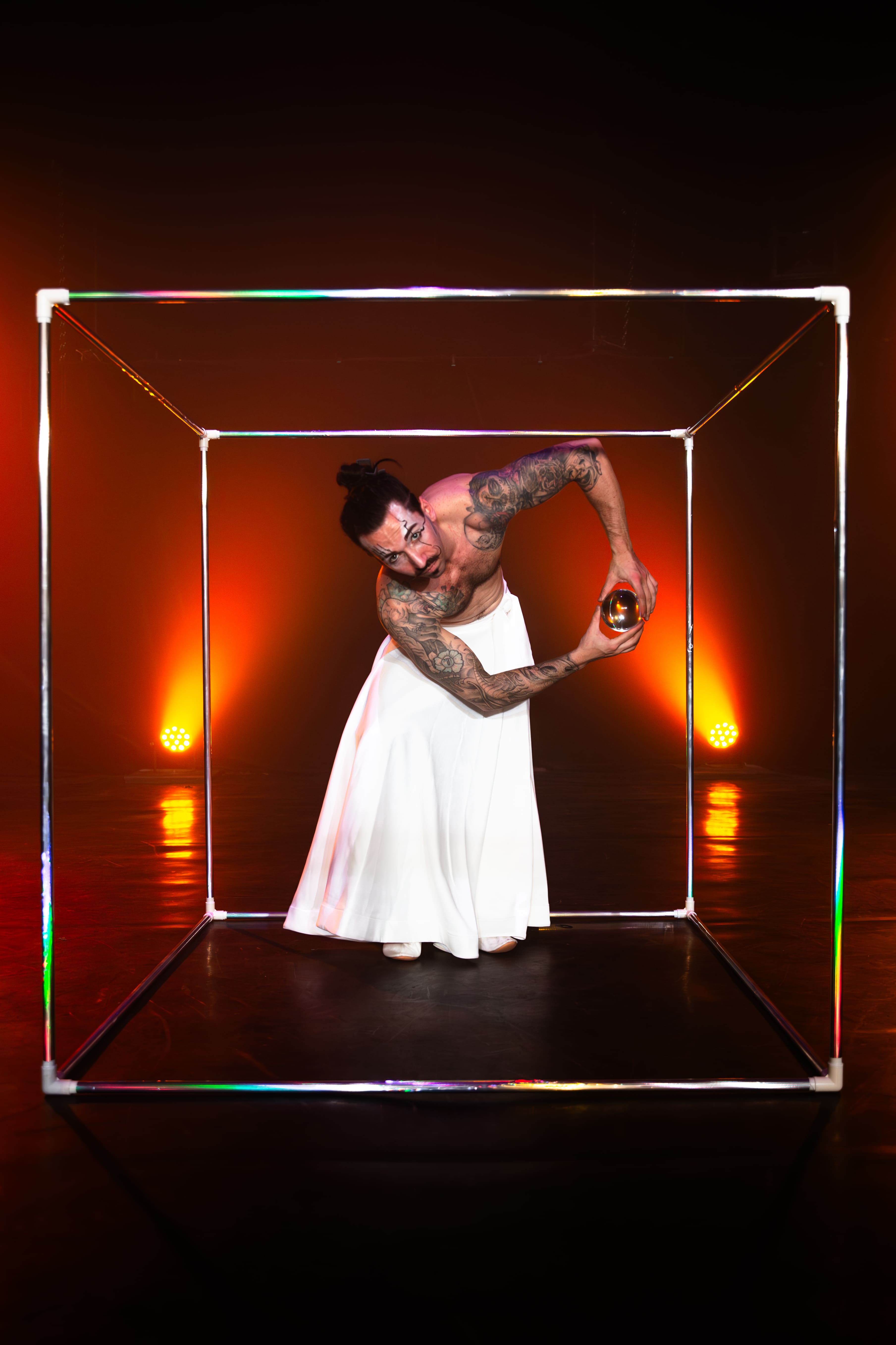 The performance opens with contact juggling. A crystal sphere appears to glide weightlessly across the hands and body, guided by controlled movement and visual illusion. Each gesture creates clean lines and subtle shifts in perception, holding the audience in focused stillness.