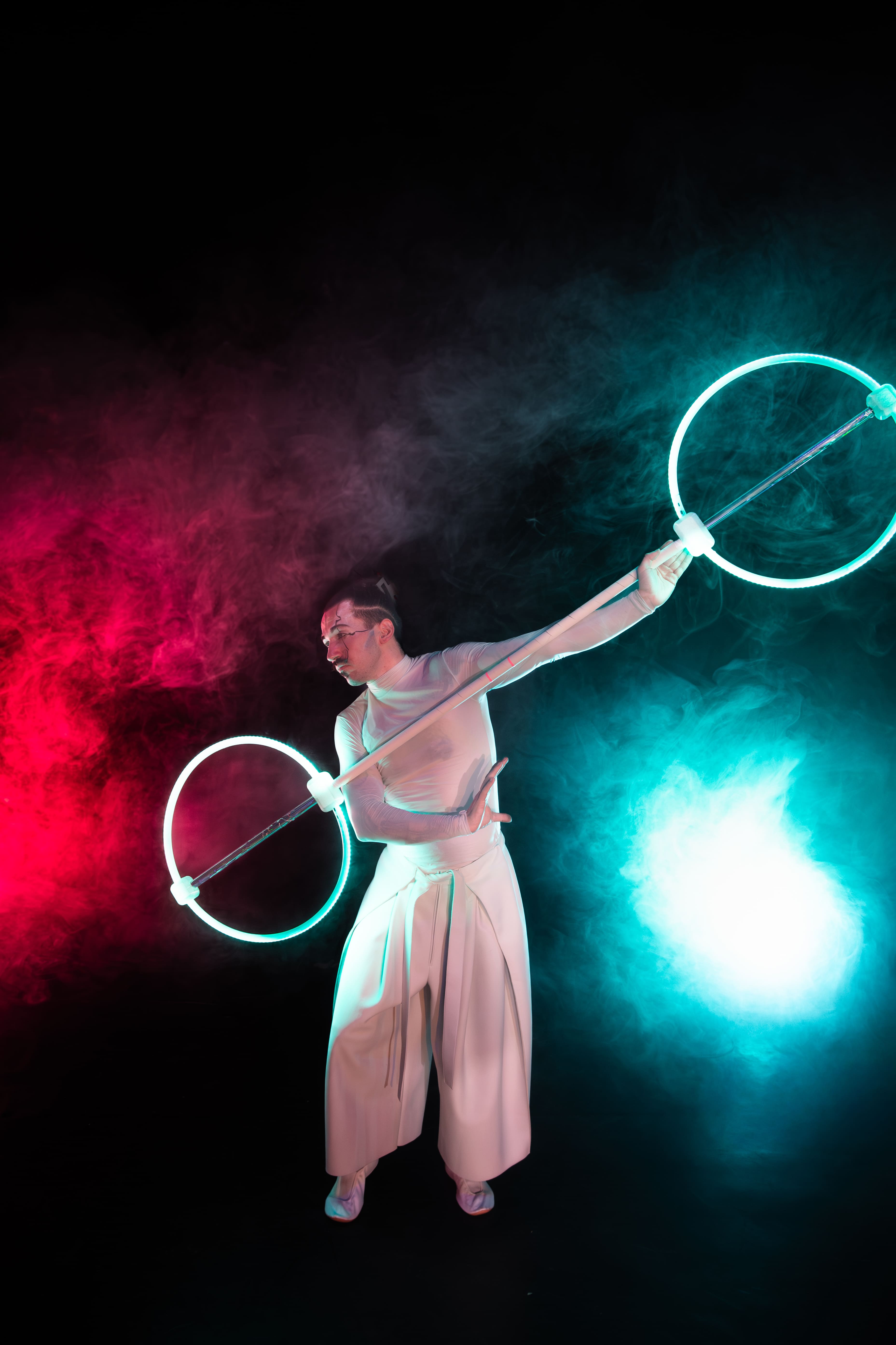 Yes. Both the music and the LED colors can be adapted to the event theme, corporate colors, or special requests. Individual acts (e.g., only LED Cyr Wheel or LED Dragonstaff) can also be booked separately.